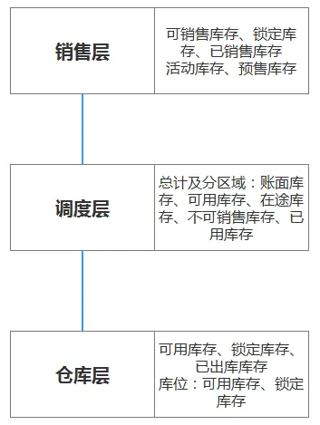 在商品的库存管理方面起到核心作用,一般采用分层设计,分为销售层、调度层和仓库层,每层对应有不同的商品状态以对库存进行增加、锁定、解锁、扣减、返还等操作。具体如下图所示: