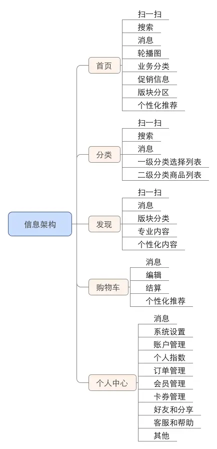 作为电商前台产品,主要是将信息整合分类后更好地呈现给C端用户,应该依据用户心智模型、产品核心理念做信息架构,布局页面内容。好的信息架构应该符合用户认知习惯,具有一定的延展性,保证信息分类标准的一致性、相关性和独立性,同时有效平衡信息架构的“广度”和“深度”。