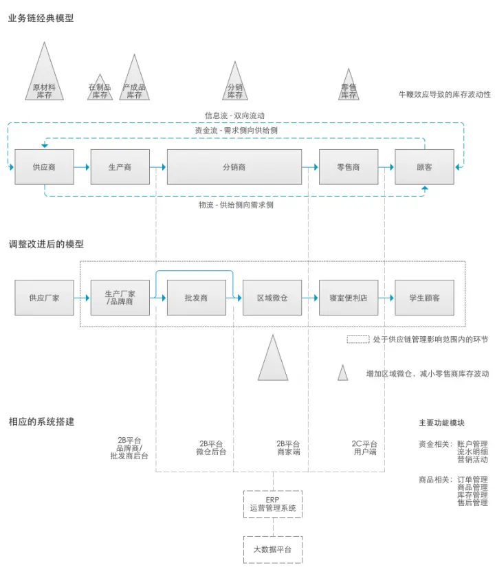 要认识电商后台乃至整个电商业务的本质,我们不妨来看一下电商业务中处于核心地位的供应链模型。供应链管理是企业三大核心职能(研发、营销、供应链)之一,供应链模型为我们展示了物流、资金流和信息流在整个业务体系中的流转形式,下面就是笔者曾负责过的一个项目由供应链模型向业务系统模型转化的过程演示。