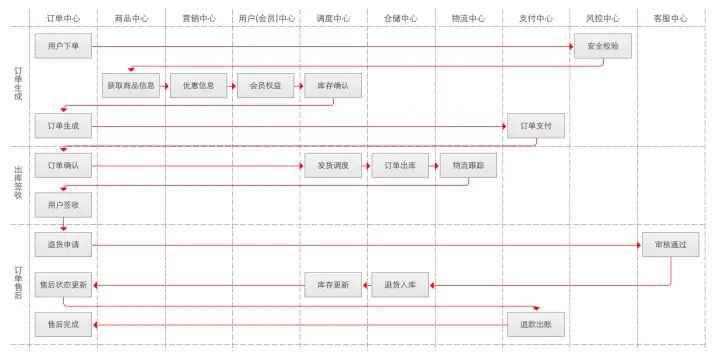 简单的说,业务链路即是通过对各业务模块数据及服务的调用所形成的一条功能线路。例如下单-发货-售后的这个订单链路体系中,不同模块在不同阶段被调用了不同的功能以满足交易需求,订单链路的示意图如下: