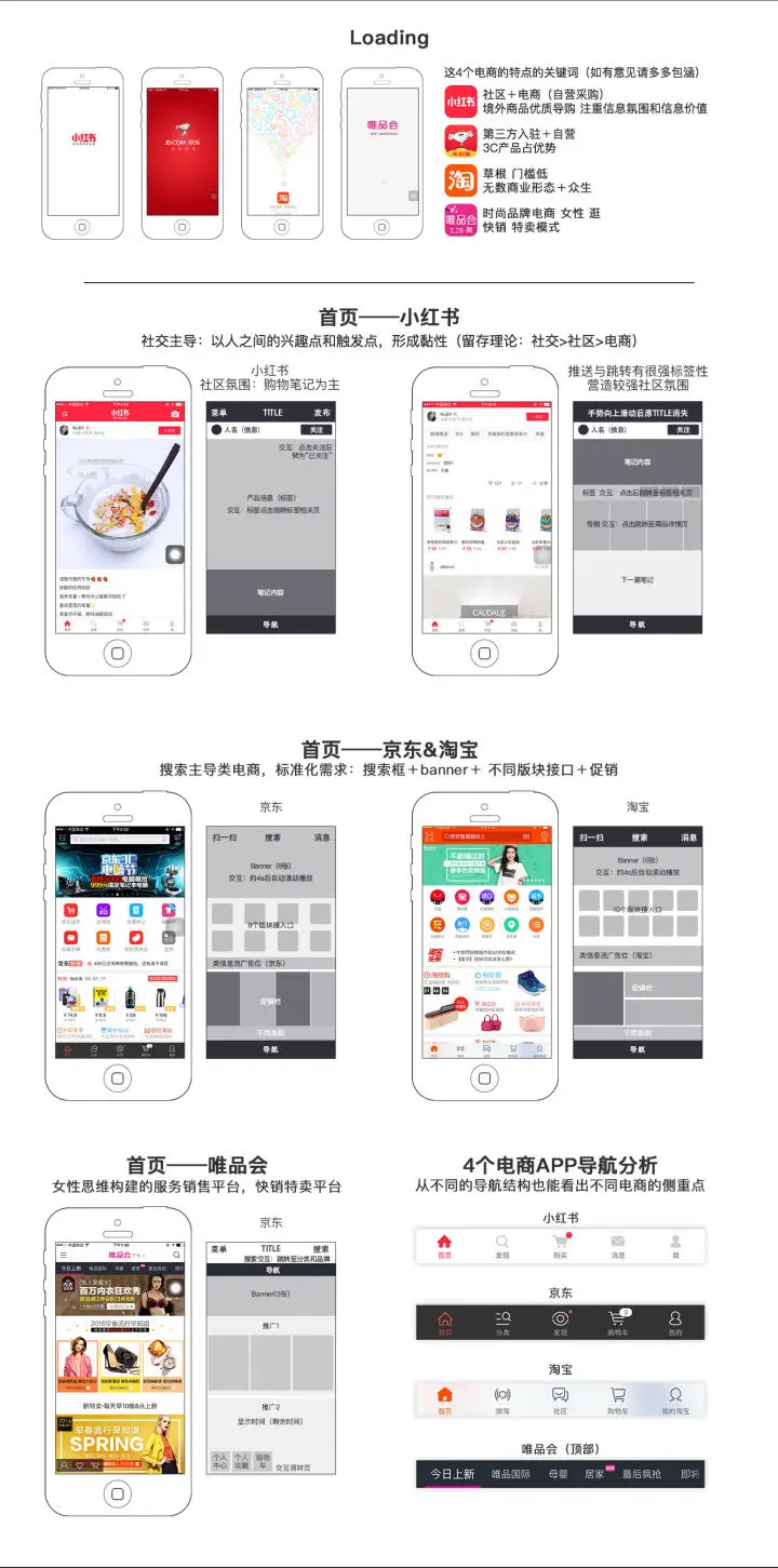 通过以上三个主要阶段的用户体验设计,可以有效提升转化率和复购率。当然这里的概括较为笼统,在具体的产品针对特定人群时,还可以建立更为精准的用户心智模型来为产品设计提供指导,以下是针对市场上几个主流电商产品首页的用户体验设计所作的简要分析,供大家参考。