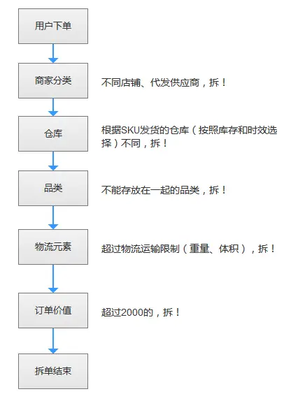 订单中心的订单状态变更将会引起交易系统中支付中心、库存中心、会员中心等一系列模块的后续状态变更和操作。OMS系统除了对订单状态进行管理外还会根据下列元素对订单进行拆单操作,以方便发货和结算。