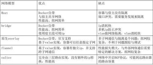 网络模型是任何云环境都必须面对的问题,因为网络规模一旦扩大之后,会带来各种问题。网络选型这块,针对 Docker 和 Kubernetes 的特性,对六种组网方式进行了对比,如下所示: