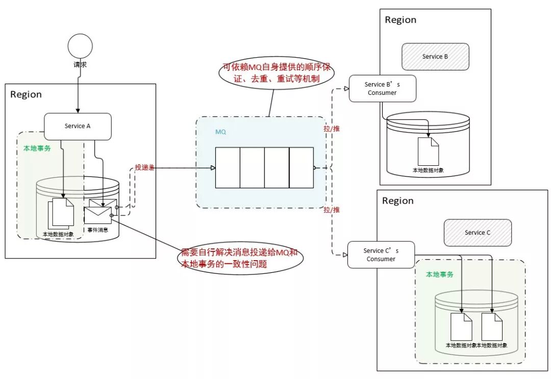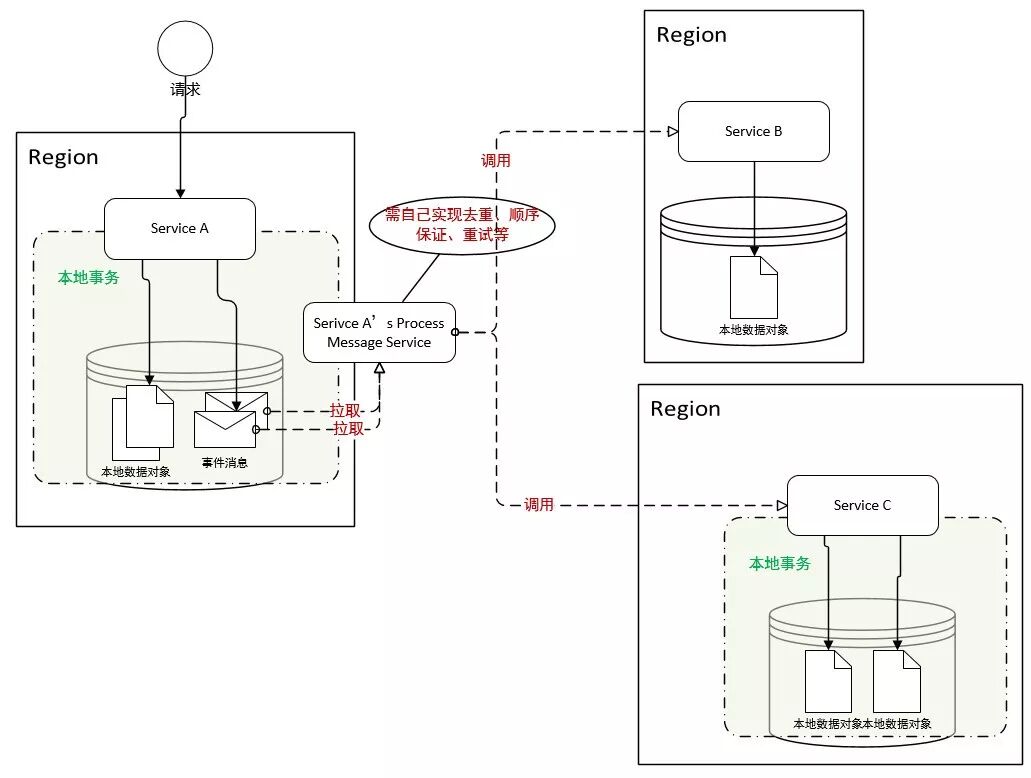 这种实现方式的思路,源于ebay,与提出BASE理论在同一篇论文中[4]。设计思想是将远程分布式事务拆分成一系列的本地事务,借助关系型数据库中的表即可实现。