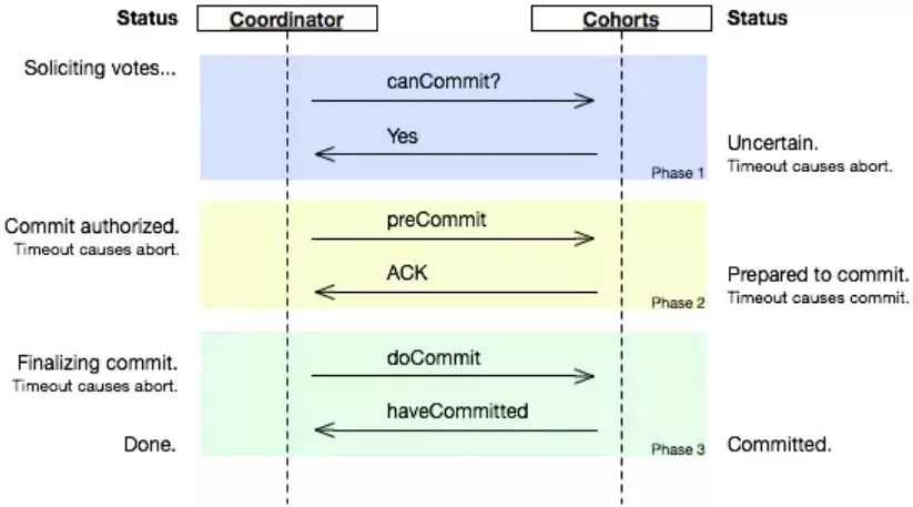新引入了timeout机制,在发生超时执行默认约定,避免了永久阻塞,也因此对多个参与者下的100%数据一致性作出了妥协。比如,协调者在向参与者A发送「doCommit」时timeout了,会引发广播「abort」,但是这个「abort」又未能投递到参与者B,导致参与者B执行了「ACK」后的timeout默认约定「commit」。
