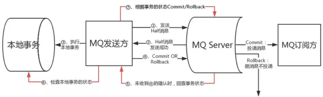 据我所知,目前唯一支持事务的MQ框架是RockerMQ,并且于近期才开源了事务部分实现。这样的确能省很多事,直接放一张阿里方面给出的图感受一下实现细节: