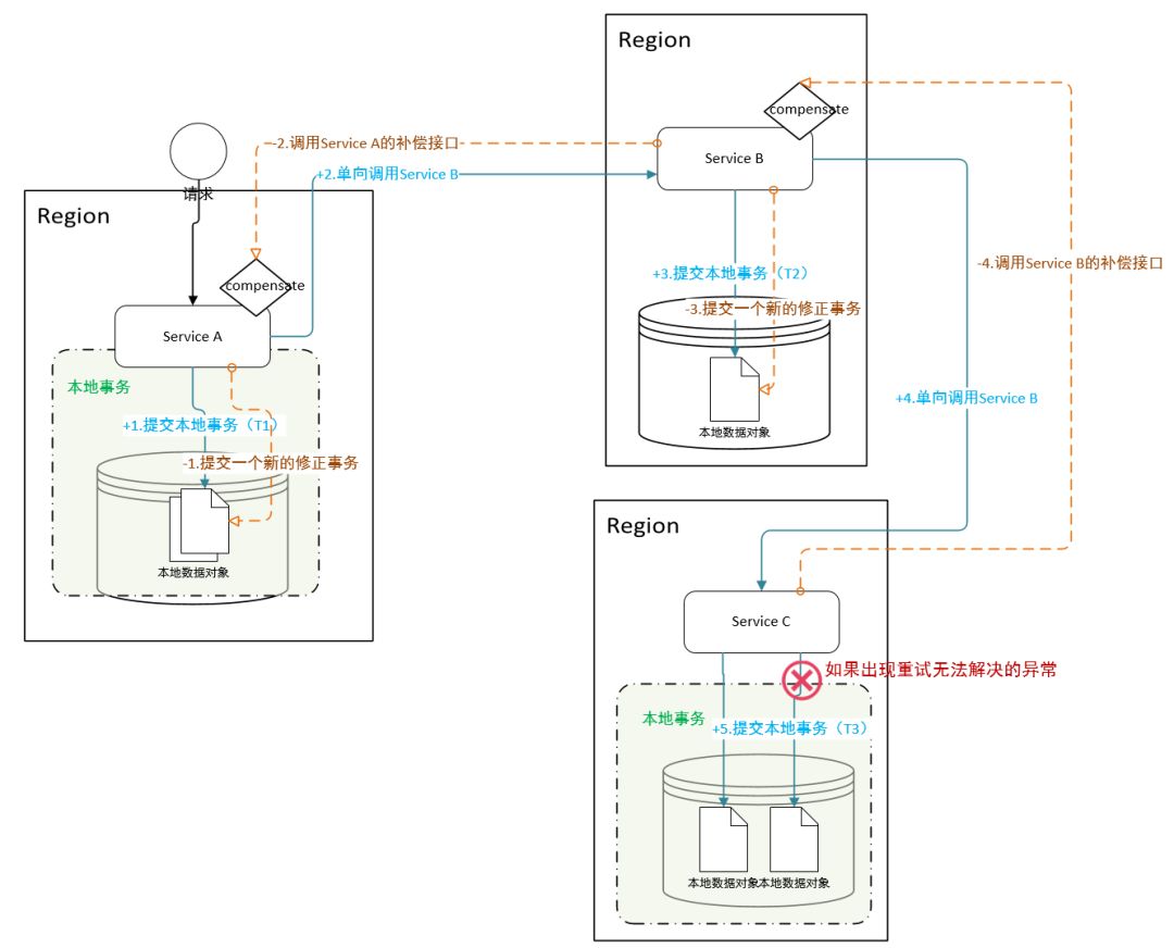 将一个分布式事务拆分为多个本地事务,并且击鼓传花给下一个,不用阻塞本地事务等待响应。且允许嵌套至多一层子事务。
