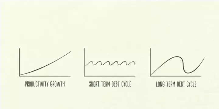债务量的波动有两大周期:其中一个周期持续 5-8 年,另一个大约持续 75-100 年,大部分人虽然能感受到波动,但由于离波动太近,每天每周都身临其境,我们将考察这三种动力,并观察他们是如何相互作用,以及他们在日常经济中的表现。