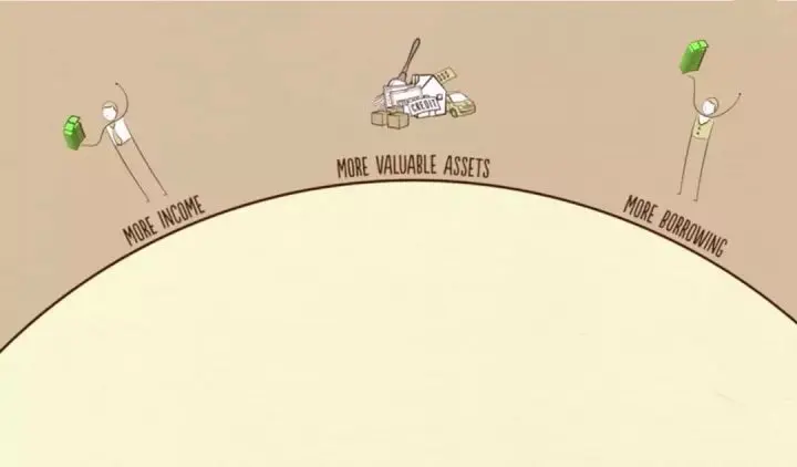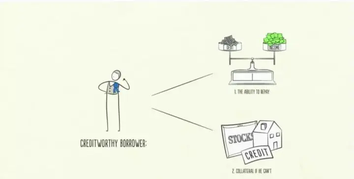 借款人一旦获得信贷并可以增加自己支出,别忘记:「支出是经济的驱动力」,因为一个人的支出是另一个人的收入。如果某人挣的钱越多,贷款人就更愿意把钱借给他,因为他的信用度很高。信用良好的贷款人具备两个条件:偿还能力和抵押物。收入债务比率高,借款人就具备偿还能力。如果无法偿还,借款人还可以用有价值、可出售的资产作为抵押物。这样,贷款人就可以放心把钱借给他们。