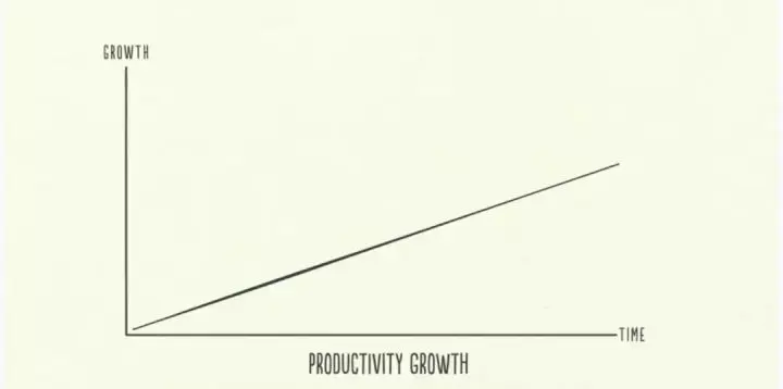 如上所述,经济的上下起伏不是取决人们多么善于创新或勤奋工作,而是主要看信贷的总量,我们先想象一下没有信贷的经济运行:增加支出唯一的办法是增加收入,因此需要提高生产率和工作量,当我或另一个人提高生产率的时候,经济就会增长,总结下来,会发现一条增长缓慢的「生产率增长轨迹渐近线」。