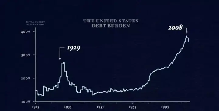 几十年来,债务负担缓慢增加,使偿债成本越来越高,到了一定程度,偿债成本的增加速度超过收入,迫使人们削减支出。由于「一个人的支出是另一个人的收入」,收入开始下降,信用开始降低,借贷减少。偿债成本持续增加,使支出进一步减少,周期开始逆转,这时到达长期债务的顶峰,债务负担变的过重。