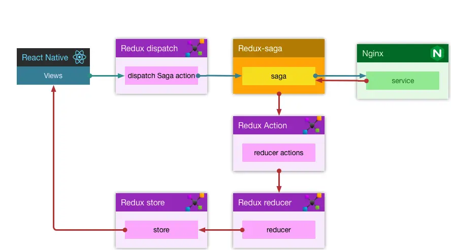 可以看到在使用了Saga后,react只负责数据如何展示,redux来负责数据的状态和绑定数据到react,而Saga处理了大部分复杂的业务逻辑。