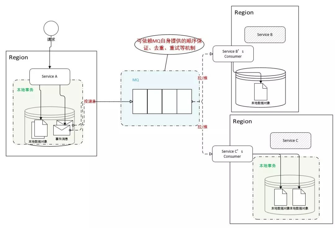据我所知,目前唯一支持事务的MQ框架是RockerMQ,并且于近期才开源了事务部分实现。这样的确能省很多事,直接放一张阿里方面给出的图感受一下实现细节: