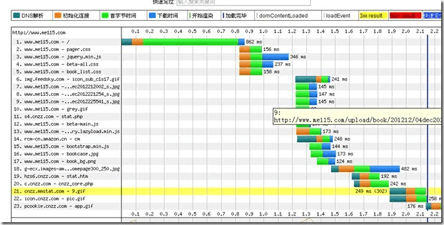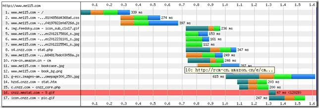 查看最终的测试结果,整体实现了较大的性能提升,最终页面展现时间为1.62s(测试使用的是一个第三方web测速工具,所有测试结果是在第三方本地无缓存的条件下进行)。仔细观察本站最后几个加载项:有一个第三方网站的广告(加载广告的时刻,页面已经全部呈现,对用户体验影响不大),以及cnzz的统计数据。这样看来,在第12项加载完后,整个页面就完整的呈现在用户面前,优化最终结果是1.1s,较优化前加载速度提升2s;由于物理条件(虚拟机、国外站点)所限,本次优化就到此为止(后续将在并行下载上做做文章,看是否有进一步提升空间)。