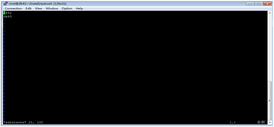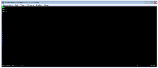 a)执行sshpass.sh的脚本的时候会去读sshhosts和sshslaves这两个文件, 修改文件sshhosts,输入全部机器的主机名,每行一个主机名(如下图) 命令: vi /root/DKHPlantform/autossh/sshhosts 通过按键盘上的insert或是I键进入编辑模式,编辑完成后按一下Esc键然后按一下按Shift+:键,输入wq,后回车就可以保存。输入q!后回车则是放弃保存并退出.