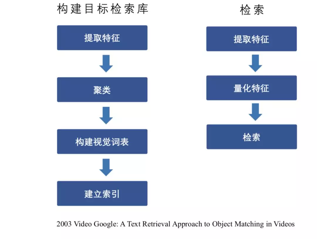 上图是视频检索的流程,是将2003年谷歌提出的文本检索的过程应用到视频的检索方案。它包括两部分,一是构建目标检索库,二是检索。获取到一些视频后,从视频中抽取帧,对这些帧图象提取特征,进行聚类,然后去构建视觉词表。