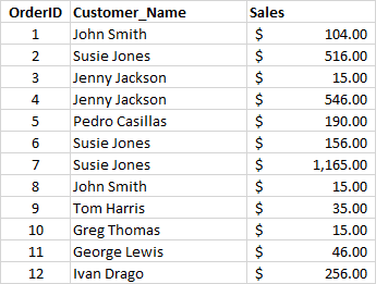 我们假设有一个的表格,其中包含以下字段:OrderID,Customer Name和Sales。一共有12行记录: