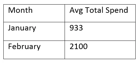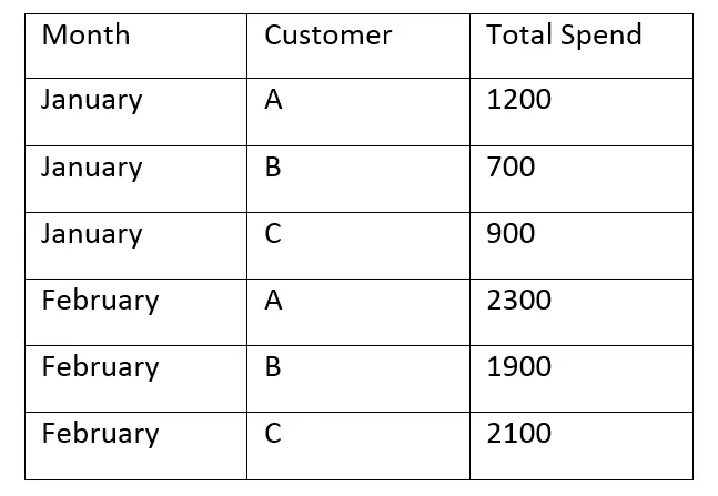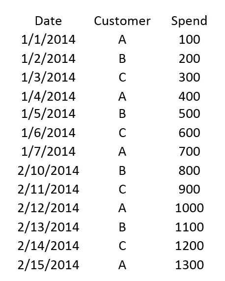 我们用以下的示例数据来举个例子。这份数据显示了在2014年的1月和2月间,有A、B和C三个客户有一些花费记录。