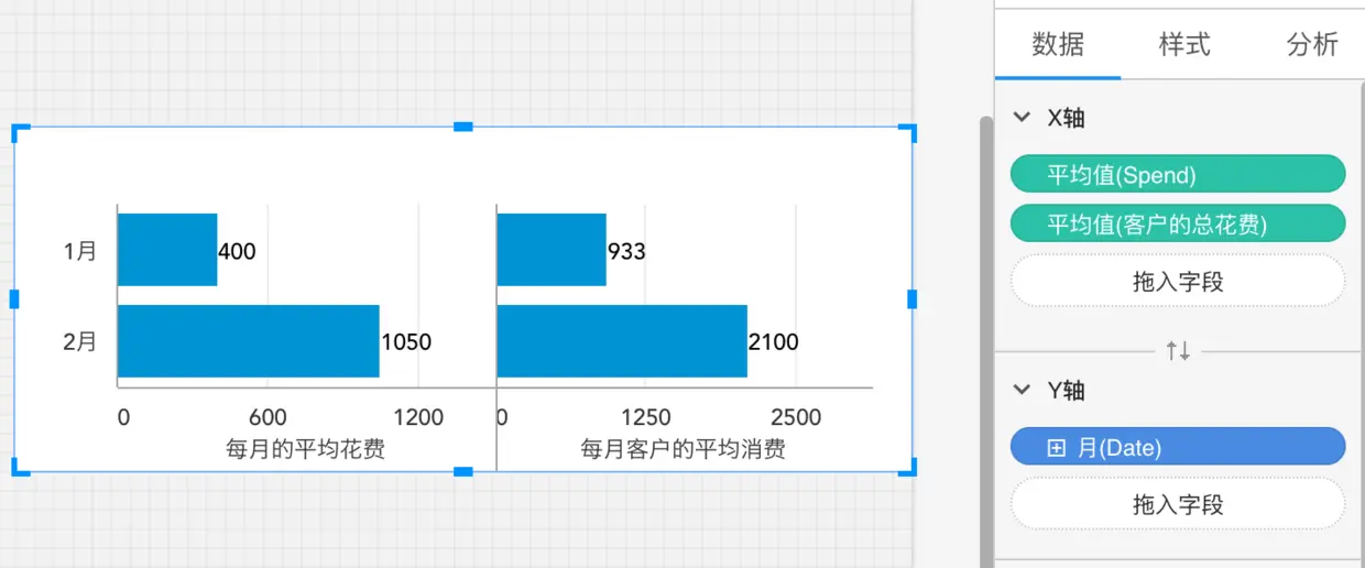 于是,我们只需要把刚才创建的“客户总花费”拖到Y轴,然后聚合方式取平均值,得到下图