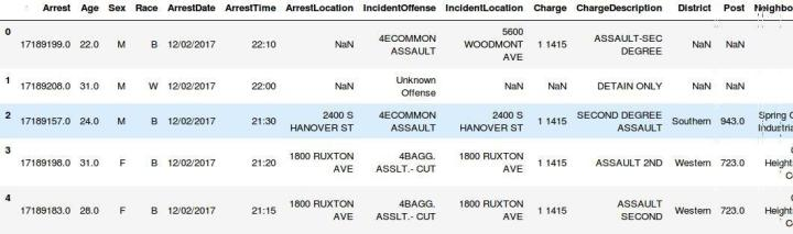 >>> crime_stats = pd.read_csv('BPD_Arrests.csv')