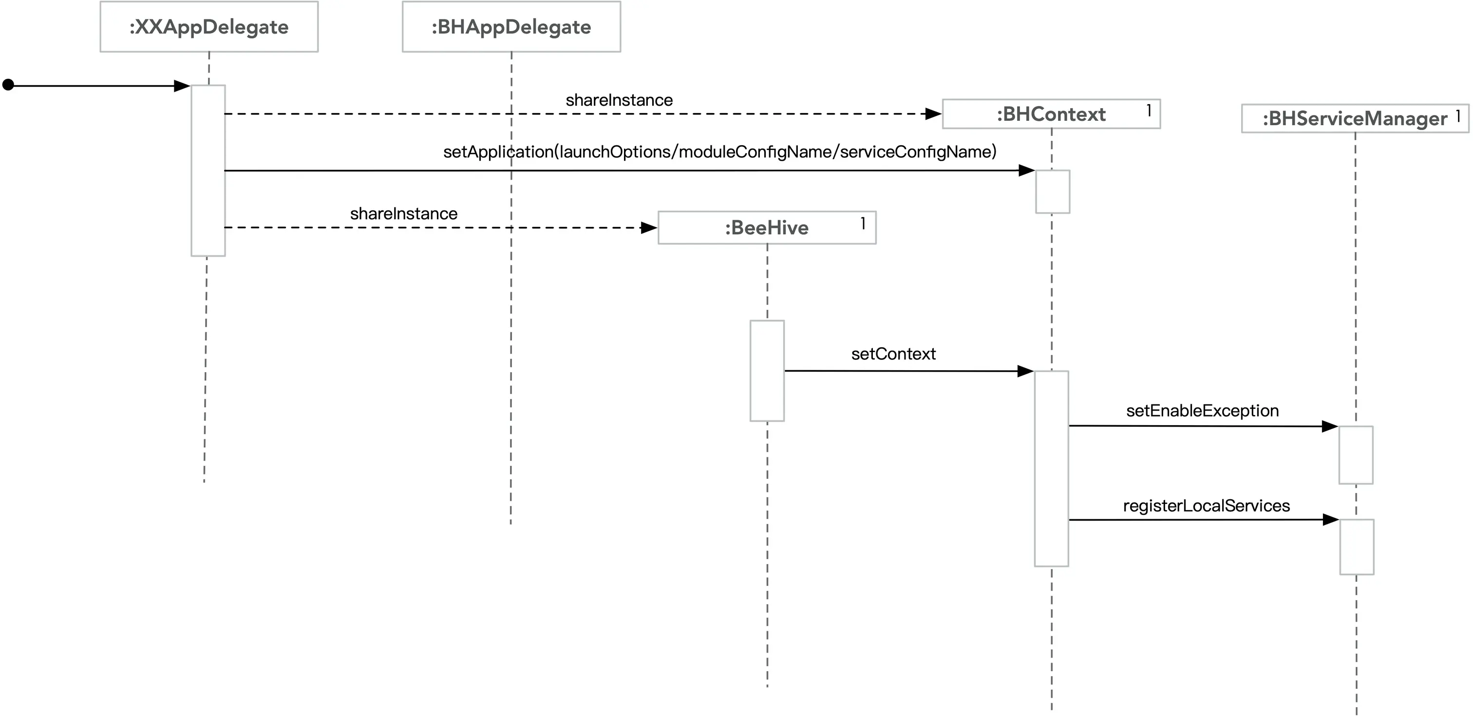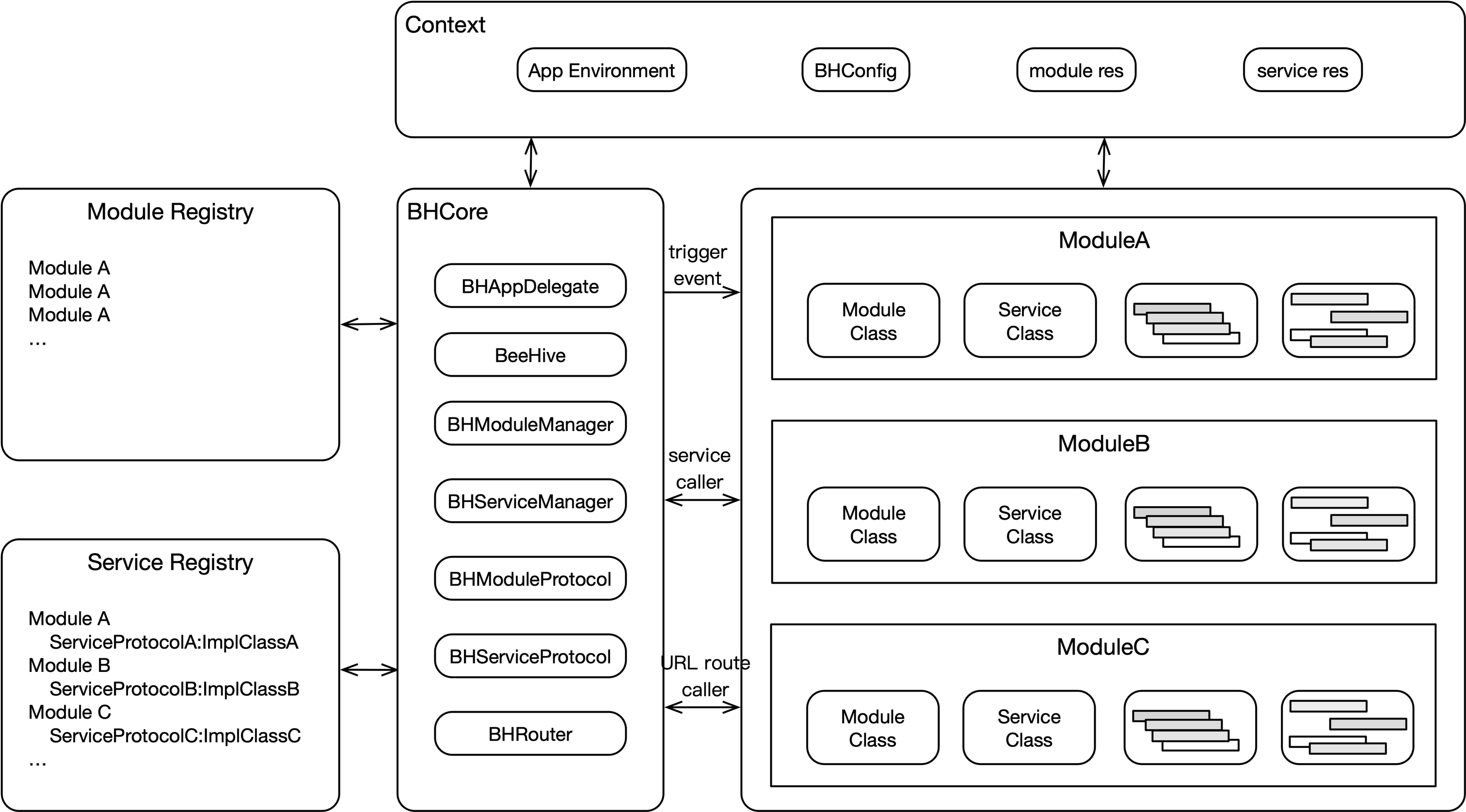 图中的BHContext,包含BeeHive的配置文件,提供全局统一上下文信息。