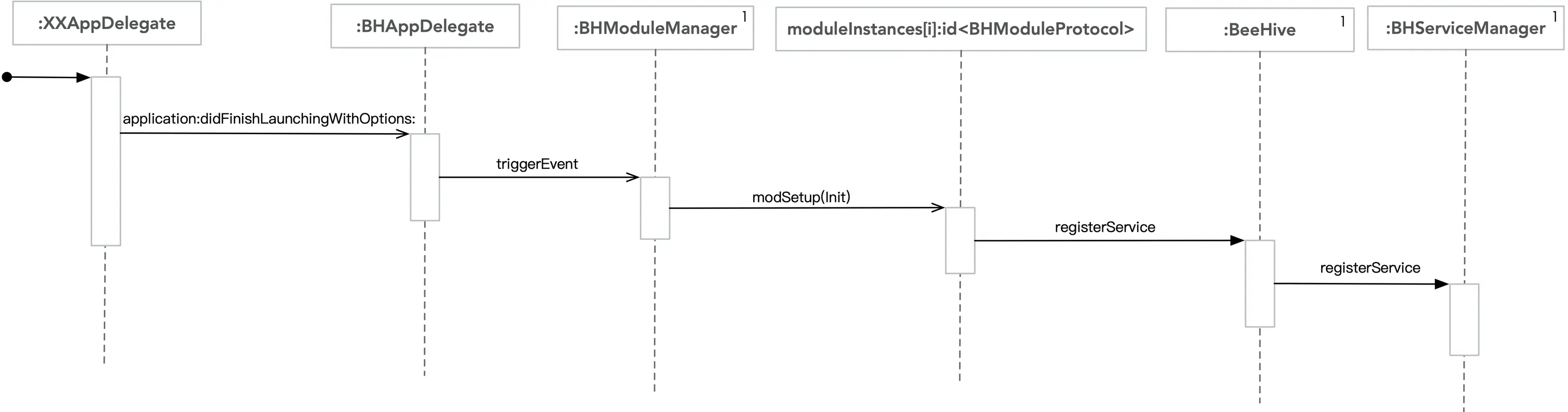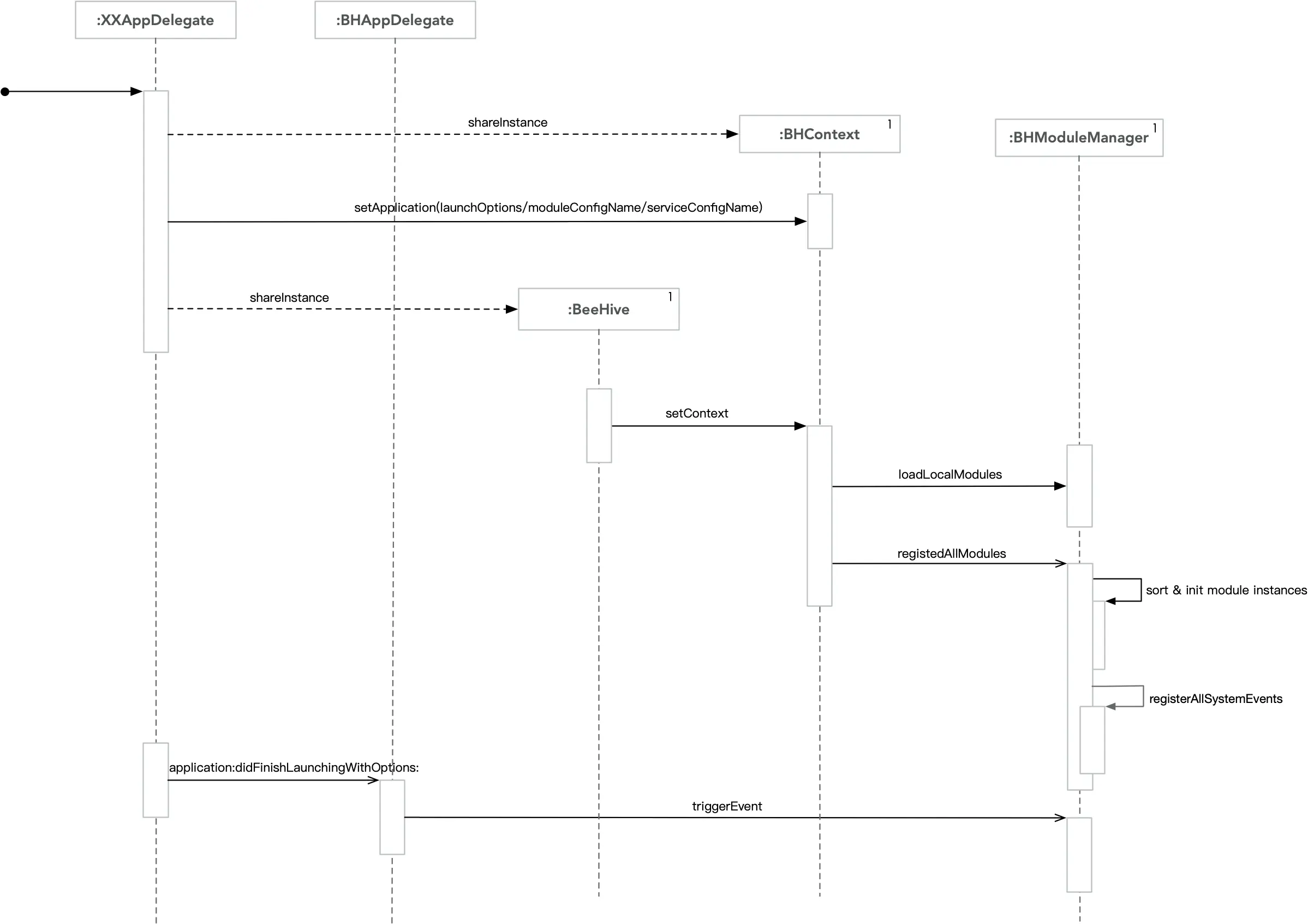 图中包含了主要的BeeHive启动过程以及Module注册的时序逻辑。Module的事件分发源于BHAppDelegate中的triggerEvent。