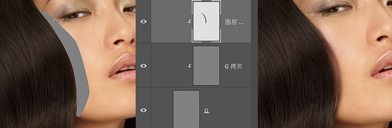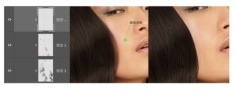 接下来在回到低频图层上,先建立一个空白图层然后向下嵌入,用画笔工具吸取皮肤的颜色把头发与颧骨、脸颊相接的位置涂抹自然。后面我们会重新绘制影子
