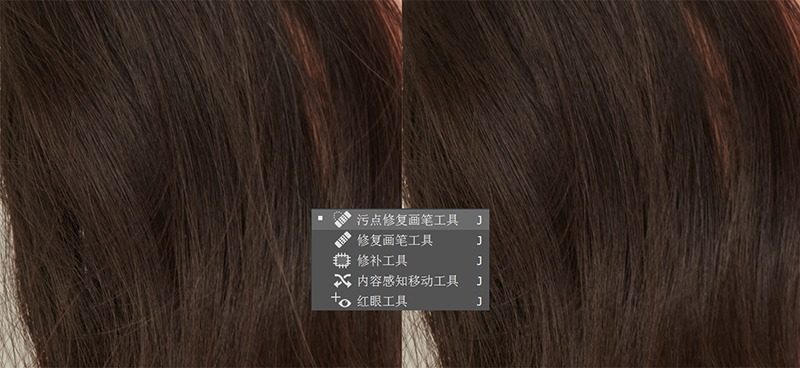 首先就是修瑕去脏,我们直接用污点修复画笔工具来去除头发上的脏点和杂发(也就是不整齐凌乱的发丝),注意污点修复画笔工具大小要适中,顺着杂发的方向去除就可以,污点修复画笔区别于修复画笔工具的地方就是污点修复画笔工具不需要取样,系统自身自动识别处理。