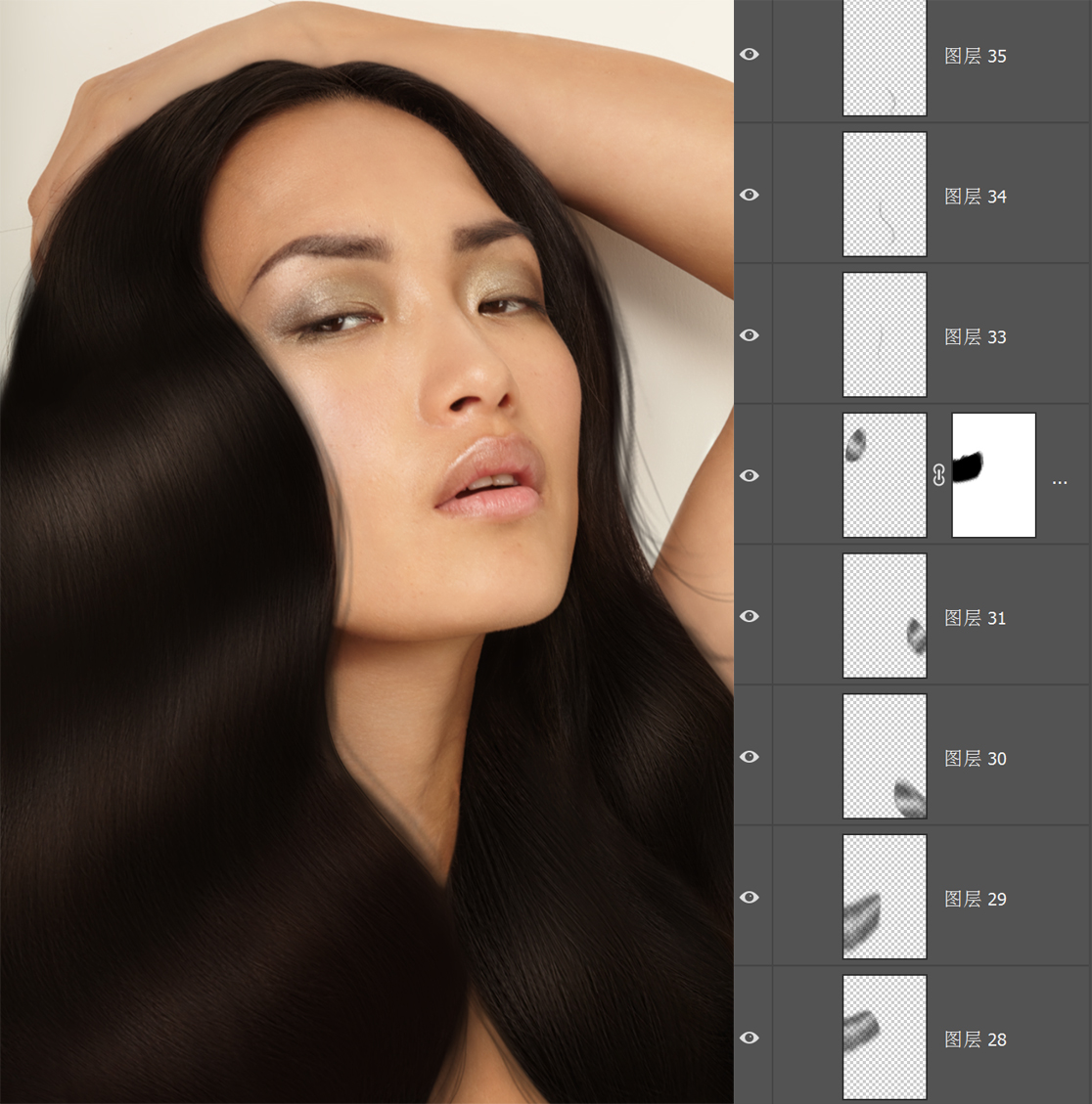无论是修头发也好,修结构、修皮肤等等,其实都没有一套特别固定的方法,都是为了达到一个目的使用各种技巧,也没有固定步骤说出个一、二、三来,所以大家在学习的过程中不要去记参数、记步骤,我们一定要弄清楚修图的思路和目的性,这样才能灵活的使用各种技巧来达到最终效果。