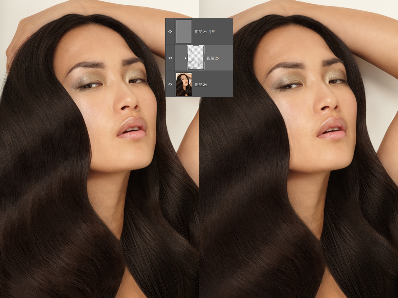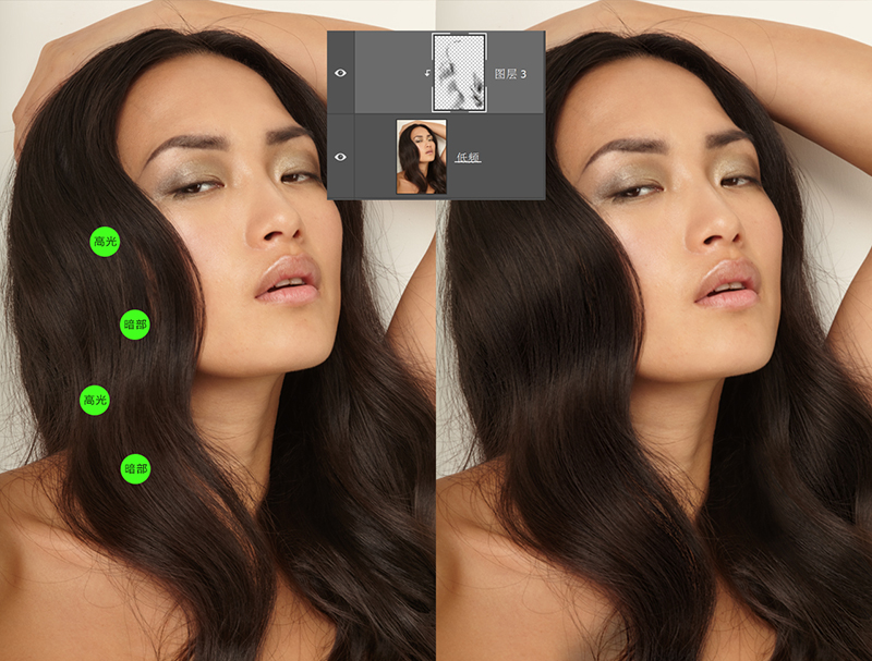 再次创建高低频图层,在低频图层智商对头发杂乱的光影进行规整化。