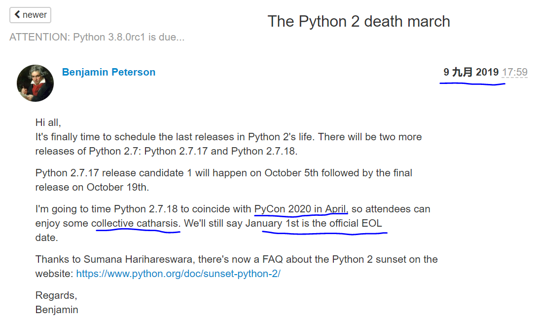 然而,我今天偶然看到一位大佬的疑问,大意如下:官网发布的 Python2 退休日期说是 4 月,那个倒计时网站是不是冒充的官方消息?