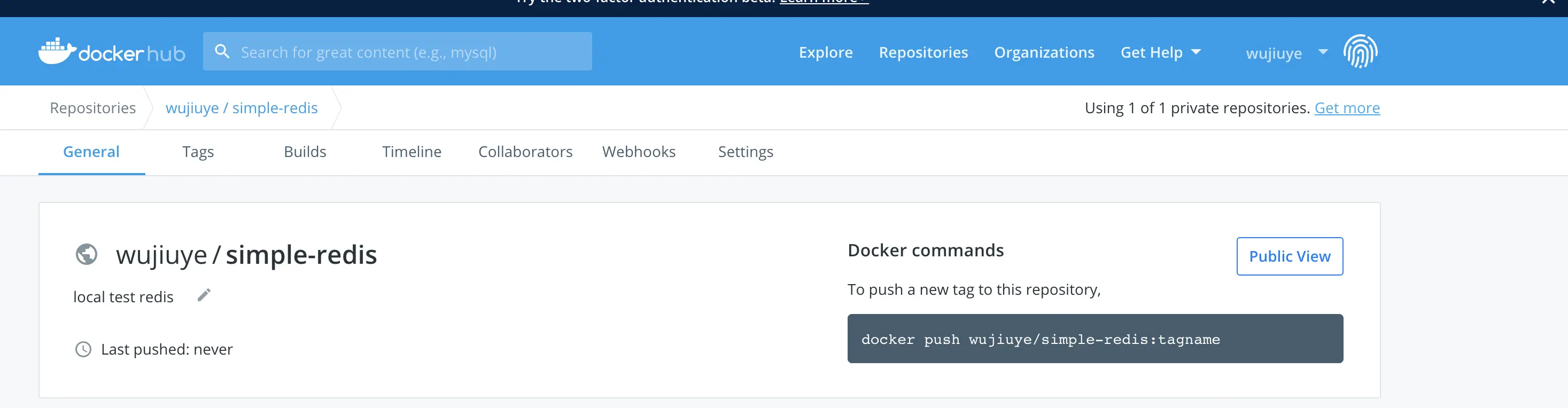 docker tag local/test-redis:1.0.5 wujiuye/simple-redis:5.0.7。本地镜像与远程仓库镜像标签不同时使用。 - 4)、