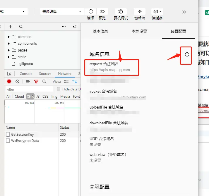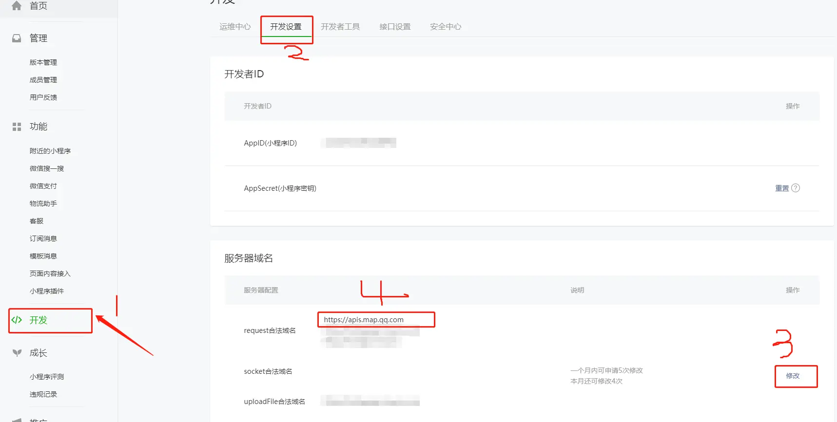 第二步: 在小程序后台,将apis.map.qq.com配置为合法域名,否则会提示:apis.map.qq.com不在以下 request 合法域名列表中具体操作如图: