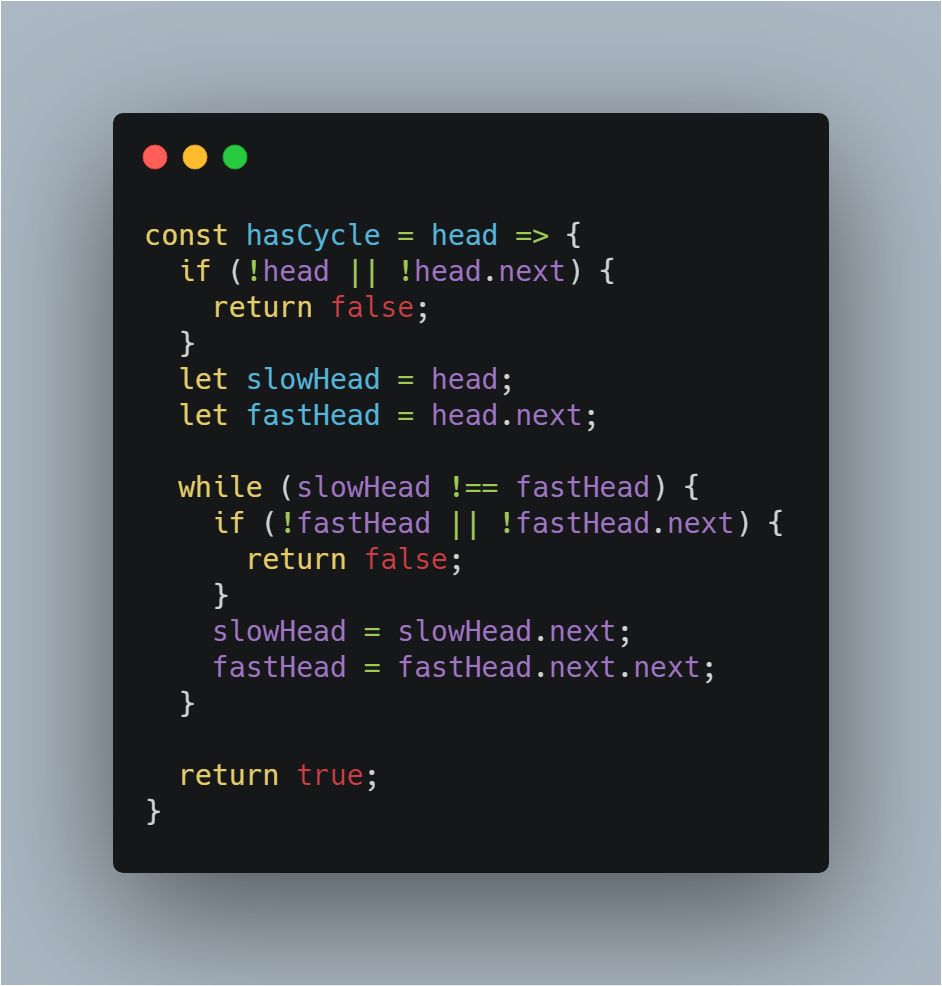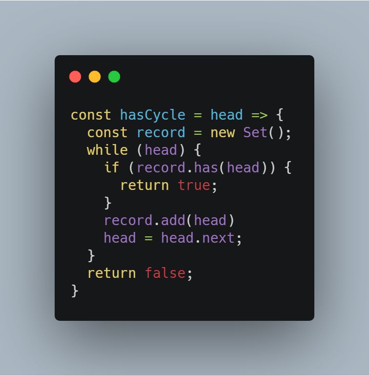 第二种解法是采用双指针中的快慢指针技巧:当链表中存在环时,快指针必然能追上慢指针。