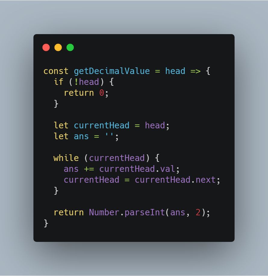 这道题目主要考察链表遍历的基本操作:迭代链表节点的 next 指针。给你一个单链表的引用结点 head。链表中每个结点的值不是 0 就是 1。已知此链表是一个整数数字的二进制表示形式。请你返回该链表所表示数字的 十进制值 。