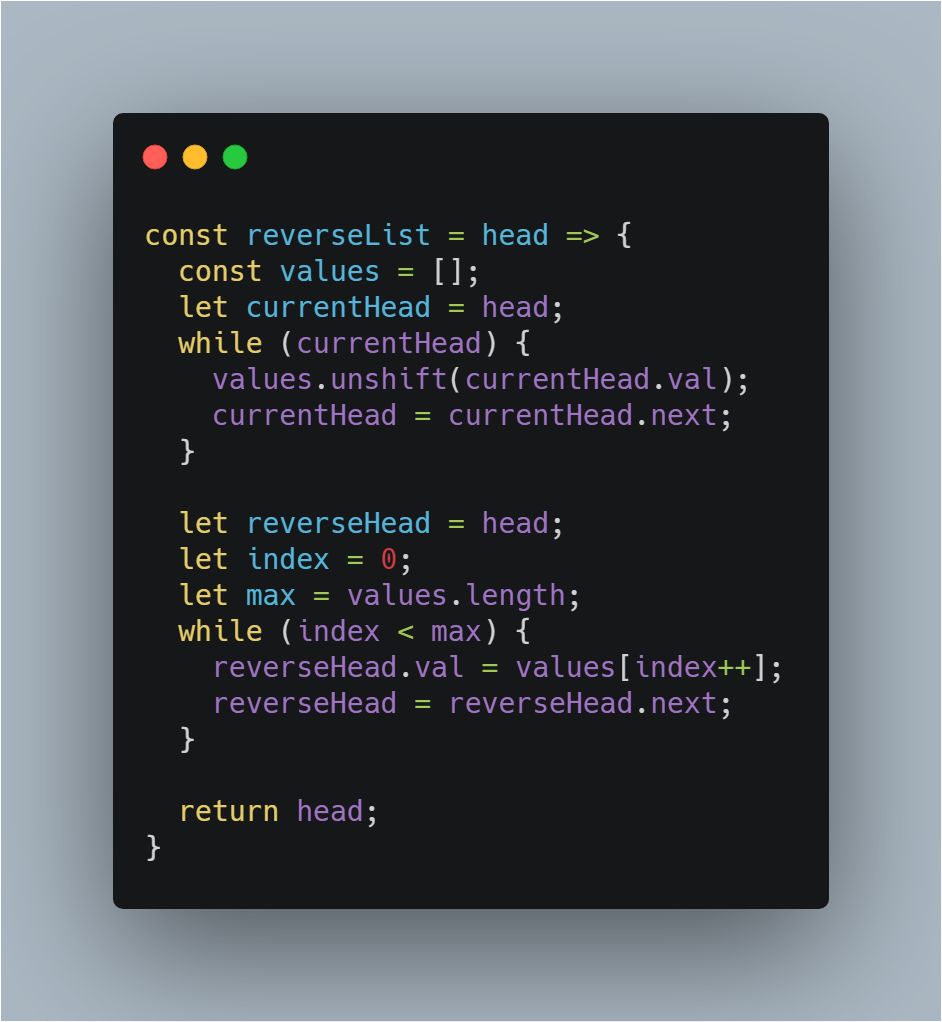 第一种解法:先遍历链表获取翻转后的链表节点值的数组,再遍历链表替换节点的值。反转一个单链表。