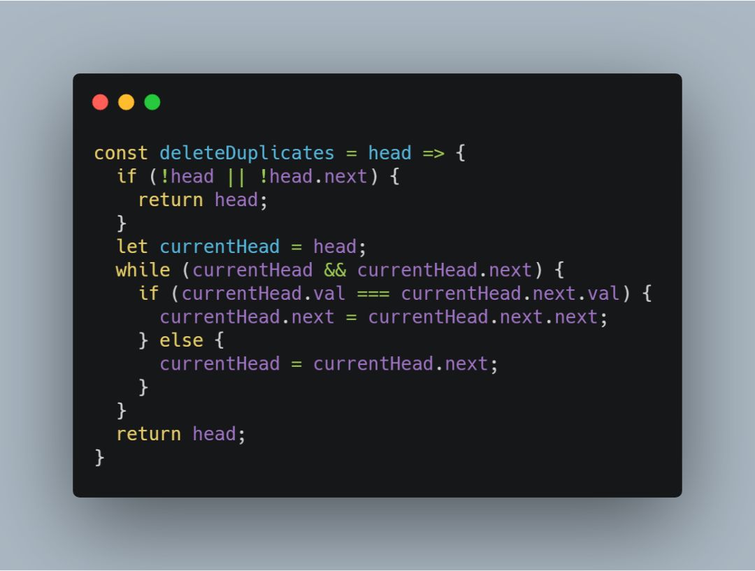 由于本道题目中的链表是一个排序链表,所以只考察了链表中删除节点的操作:改变目标节点的前驱节点的 next 指针,即可删除目标节点。给定一个排序链表,删除所有重复的元素,使得每个元素只出现一次。