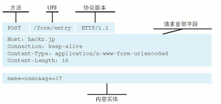 是由请求方法、请求 URI、协议版本、可选的请求首部字段 和内容实体构成的。