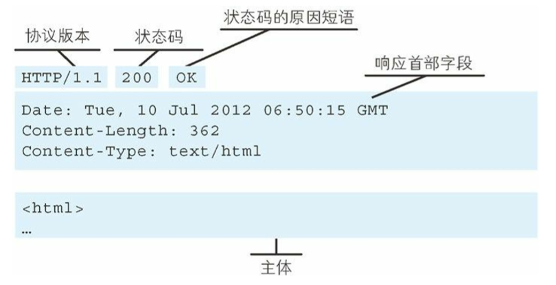 基本上由协议版本、状态码(表示请求成功或失败的数字代 码)、用以解释状态码的原因短语、可选的响应首部字段以及实体主 体构成。