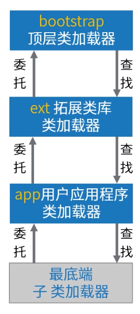 为了避免重复加载,由下到上逐级委托,由上到下查找