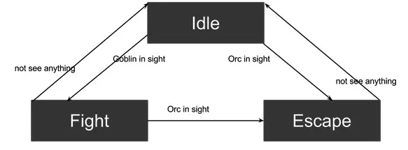首先要说一下有限状态机(FSM),一般应用于游戏机器人,网络协议,正则表达式,词法语法分析,自动客服等。如下图是一个简单的游戏机器人状态转移和行动图。