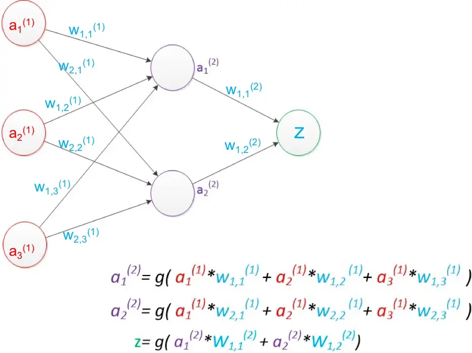 深度学习是机器学习中人工神经网络算法的延伸和发展,近期深度学习的研究非常火热,就在这里介绍一下神经网络和深度学习。先说两层网络,如下图,其中a是“单元”的值,w表示“连线”权重,g是激活函数,一般为方便求导采用sigmoid函数。采用矩阵运算来简化图中公式:a(2) = g( a(1) * w(1) ), z = g( a(2) * w(2) )。设训练样本的真实值为y,预测值为z,定义损失函数 loss = (z –y)2,所有参数w优化的目标就是使对所有训练数据的损失和尽可能的小,此时这个问题就被转化为一个优化问题,常用梯度下降算法求解。一般使用反向传播算法,从后往前逐层计算梯度,并最终求解各参数矩阵。