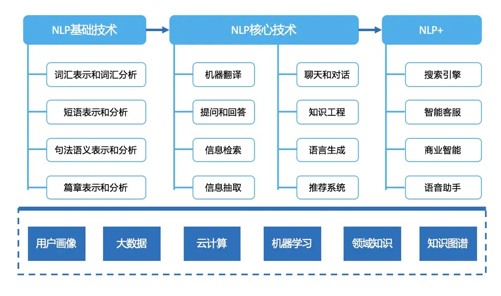 NLP是人工智能的另一个目标,用于分析、理解和生成自然语言,以方便人和计算机设备进行交流,以及人与人之间的交流。它的应用领域包括:机器翻译,文本、语音、图片转换,聊天机器人,自动摘要,情感分析,文本分类,信息提取等。以下给出了自然语言处理简要的知识架构图。