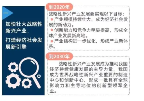 看上图,十三五规划对应 2016 ~ 2020 年,大方向是加快壮大战略性新兴产业,打造经济社会发展新引擎。