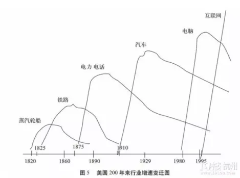 上图,是美国 200 年来行业增速变迁图,描述了从1820年的蒸汽轮船到1995年的互联网在内的,几大行业的变化趋势。国内的行业发展趋势与美国类似,但稍稍滞后几年。每一个行业的增速,均经历了增长、见顶、缓慢下降的阶段。