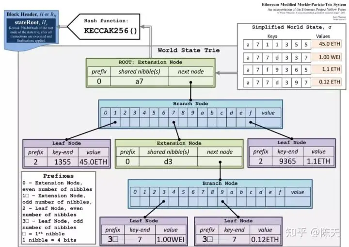 这是以太坊保存其 World State 的核心 - 我相信我的读者们了解 patricia tree (prefix tree, radix tree, 或者叫 trie),有一些区块链知识的读者应该知道 merkle tree,MPT 结合二者,组织出一个自带验证的 persistent data structure(函数式编程语言保存 list / map 的方式),关于 MPT 和以及上图,我们的工程师丁沛灵同学在上次北京 Hackathon 有一个精彩的讲座,感兴趣的同学可以去 youtube arcblock channel 上找:ArcBlock’s Introduction to Blockchain,在 37 分钟附近开始讲 MPT,大约 10 分钟,非常之深入浅出。篇幅有限,我这里就不详细展开。
