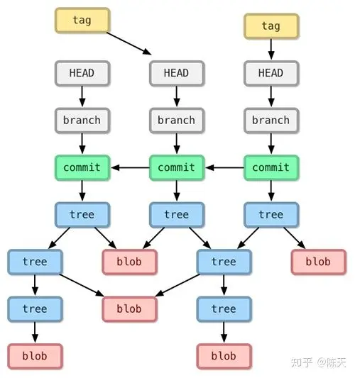 git 使用了 Merkle tree(更准确地说 Merkle DAG)来存储所有 commit 的所有 object。和 persistent data structure 思路类似,数据(commit 里的 objects)在叶子节点上,只不过连接叶子节点的索引是其 hash,而非普通的 key。Merkle DAG 的使用非常广泛,从 Plan 9 OS 到 BitTorrent,从 git 到 bitcoin / ethereum,等:
