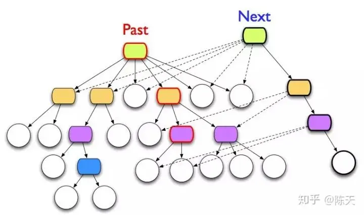 在以太坊里,其 event 是 transaction,state 使用 Merkle Patricia Tree 保存。如果把以太坊看成是一个自给自足的世界,那么其 fork 就是这个世界在平行宇宙中的另一个世界,而我们人类就像『星际穿越』中的五维人,可以在以太坊世界中进行时间旅行 —— 比如,我要回到 2017 年 1 月 13 日,去探索那个时间点这个世界里所有账户的状态,只需要找到 4904084 这个块里的 state root,找到这个 hash 下面对应的数,然后从这棵树一路往下挖掘信息。