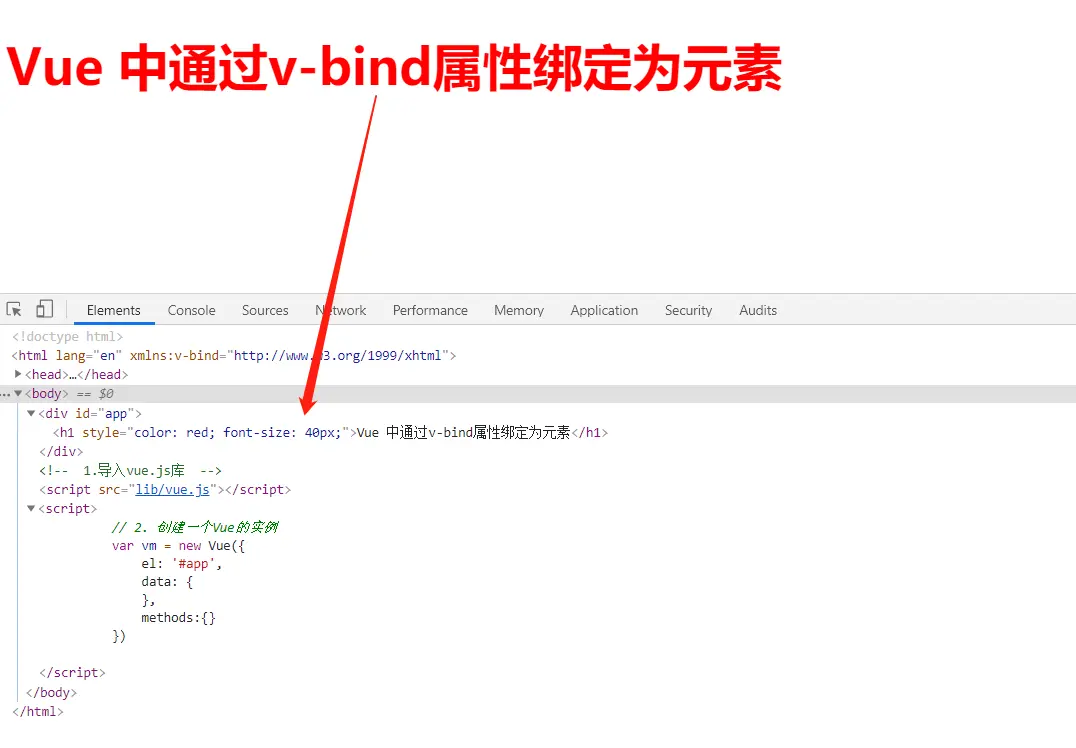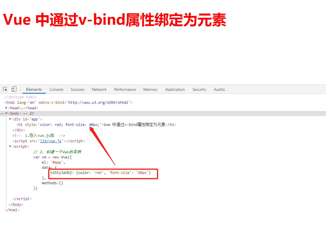 <h1 :style="{color: 'red', 'font-size': '40px'}">Vue 中通过v-bind属性绑定为元素</h1>