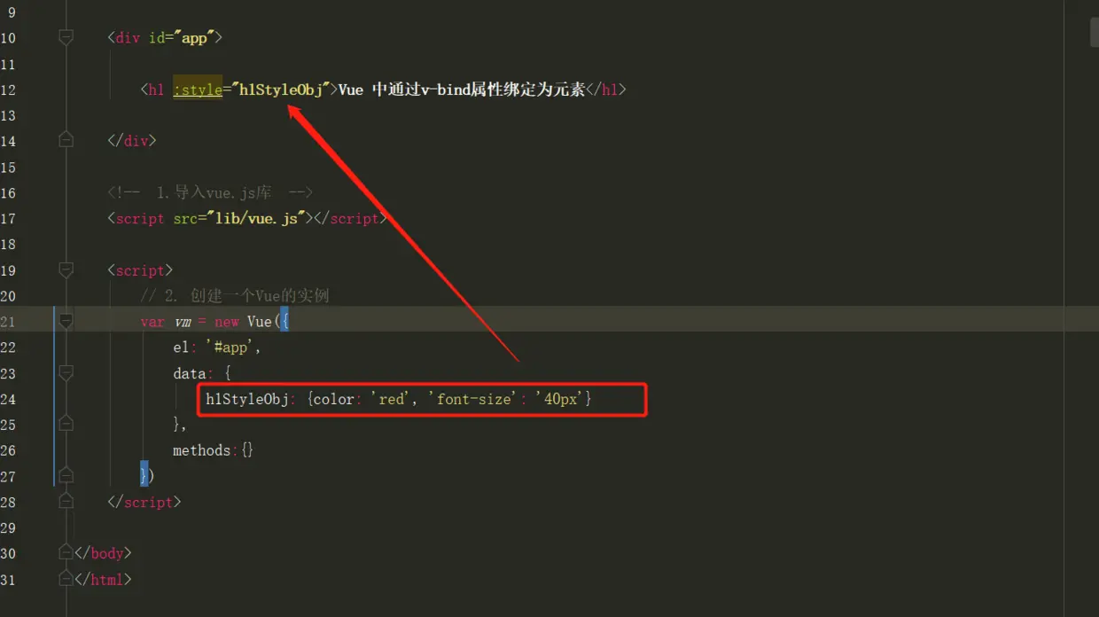 <h1 :style="h1StyleObj">Vue 中通过v-bind属性绑定为元素</h1>
